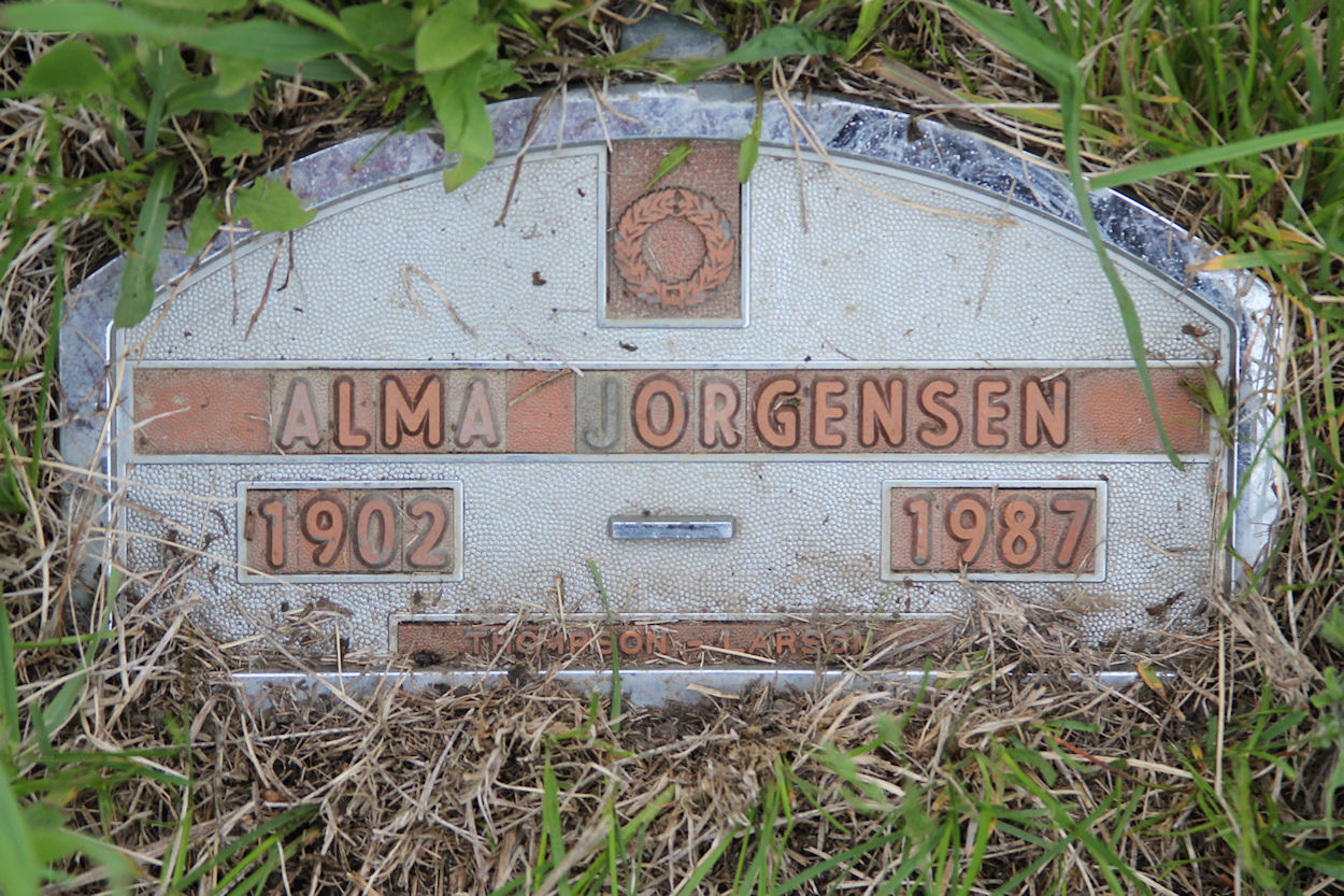 Metal marker:ALMA JORGENSEN1902-1987THOMPSON-LARSON