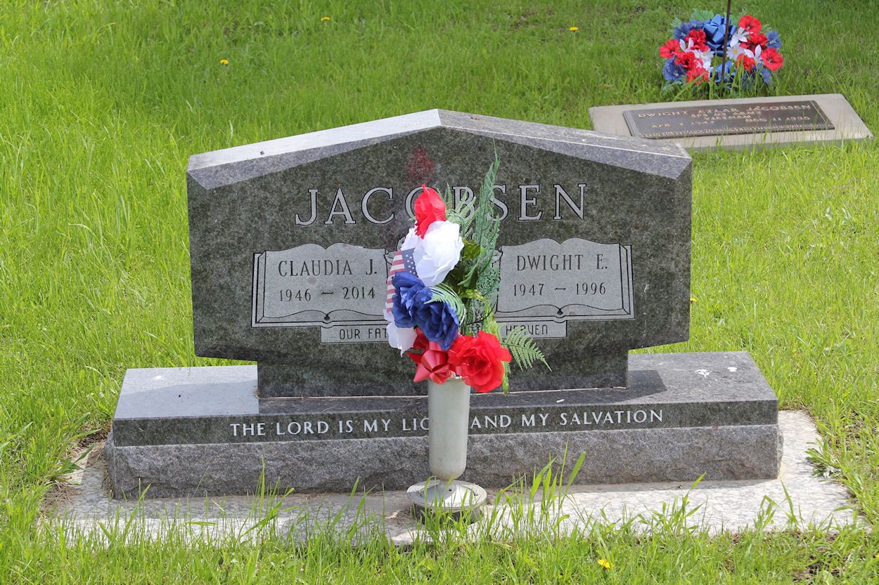 Family headstone inscription: JACOBSEN CLAUDIA J. 1946 - 2014 DWIGHT E. 1947-1996 OUR FATHER WHO ART IN HEAVEN THE LORD IS MY LIGHT AND MY SALVATION