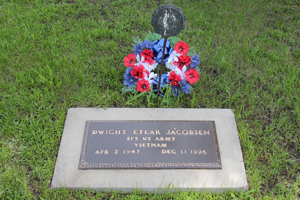 Headstone inscription:DWIGHT ETLAR JACOBSENSP5 US ARMYVIETNAMAPR 2 1947 DEC 11 1996