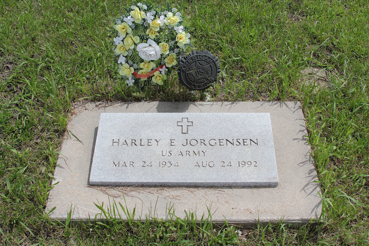 Headstone inscription:HARLEY E JORGENSENUS ARMYMAR 24 1934 AUG 24 1992