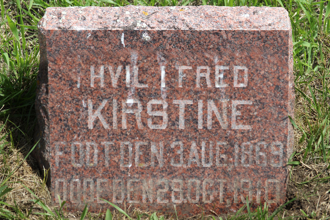 Headstone inscription: The headstone is 8" deep by 15" wide and is 11" high. It is said Kirstine Jacobsen died in childbirth and the stillborn child was buried with her. |
