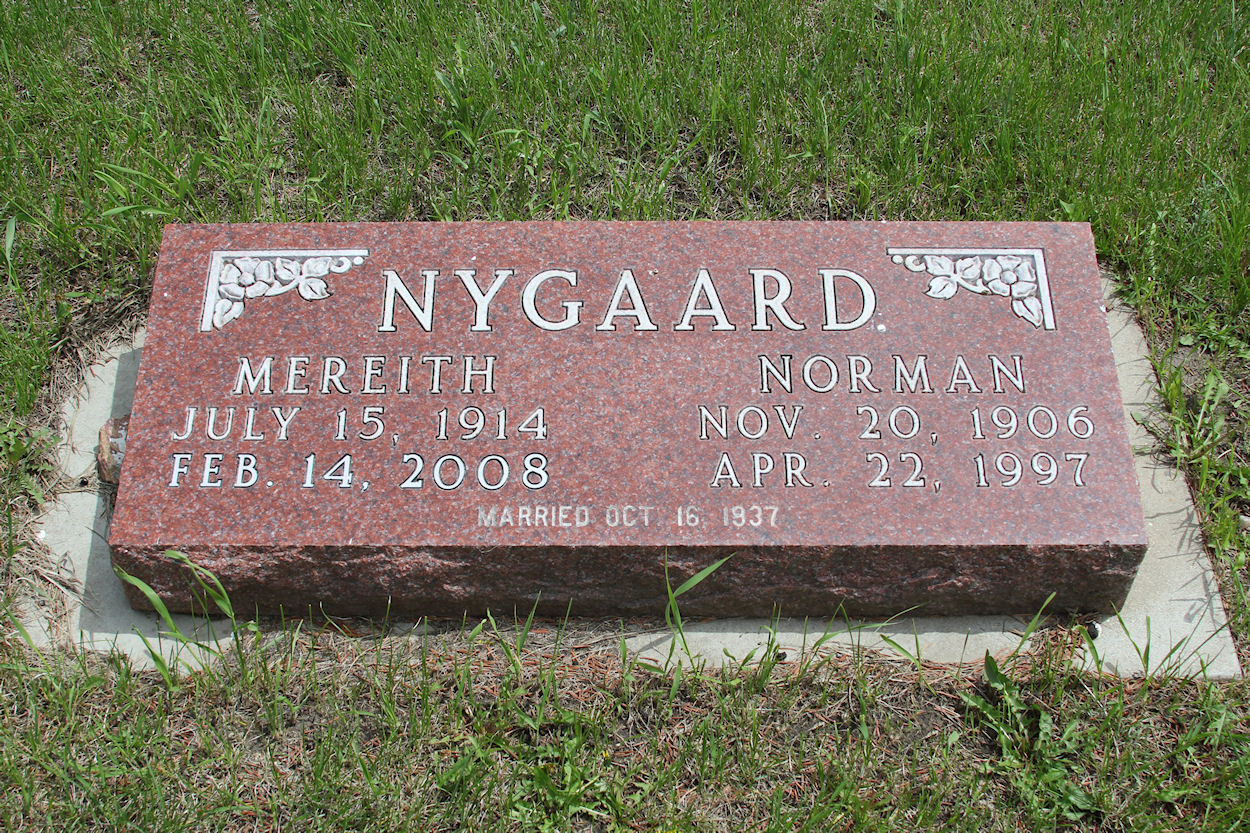 Headstone inscription:NYGAARDMEREITHJULY 15, 1914FEB. 14, 2008NORMANNOV. 20, 1906APR. 22, 1997MARRIED OCT. 16, 1937”