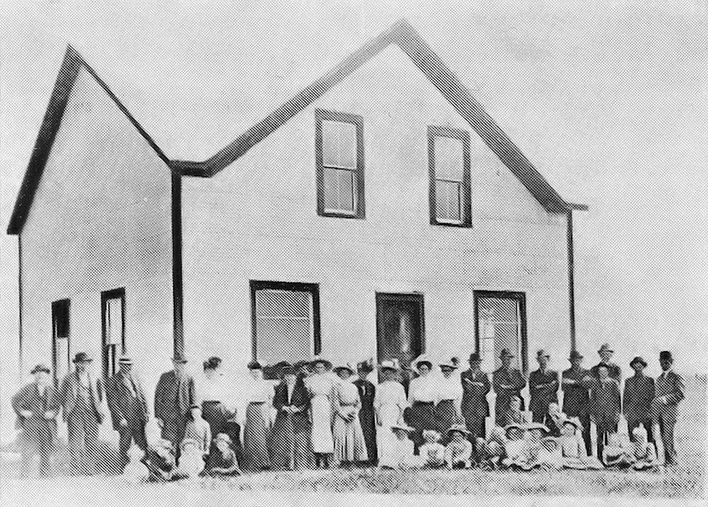 Flaxton Danish Evangelical Lutheran Congregation Church, taken in 1910. Standing from left to right: Paul Petersen, Anton Winther, Mads P. Strandskov, A. J. Nygaard, Mrs. A. J. Nygaard, Mrs. Mads Strandskov, Mrs. Paul Petersen, Lars Jacobsen, Anna Winther, Hilda Petersen, Mrs. Lars Jacobsen, Hilda Jacobsen, Mrs. Chris Rawn, Valborg Strandskov, Rebbecca Petersen, unknown, Berman Jacobsen, Viggo Strandskov, Paul Jacobsen, John Winther, Rudolf Jacobsen, Einer Strandskov, Student Pastor J. J. Larager. In the front row, children of these families.