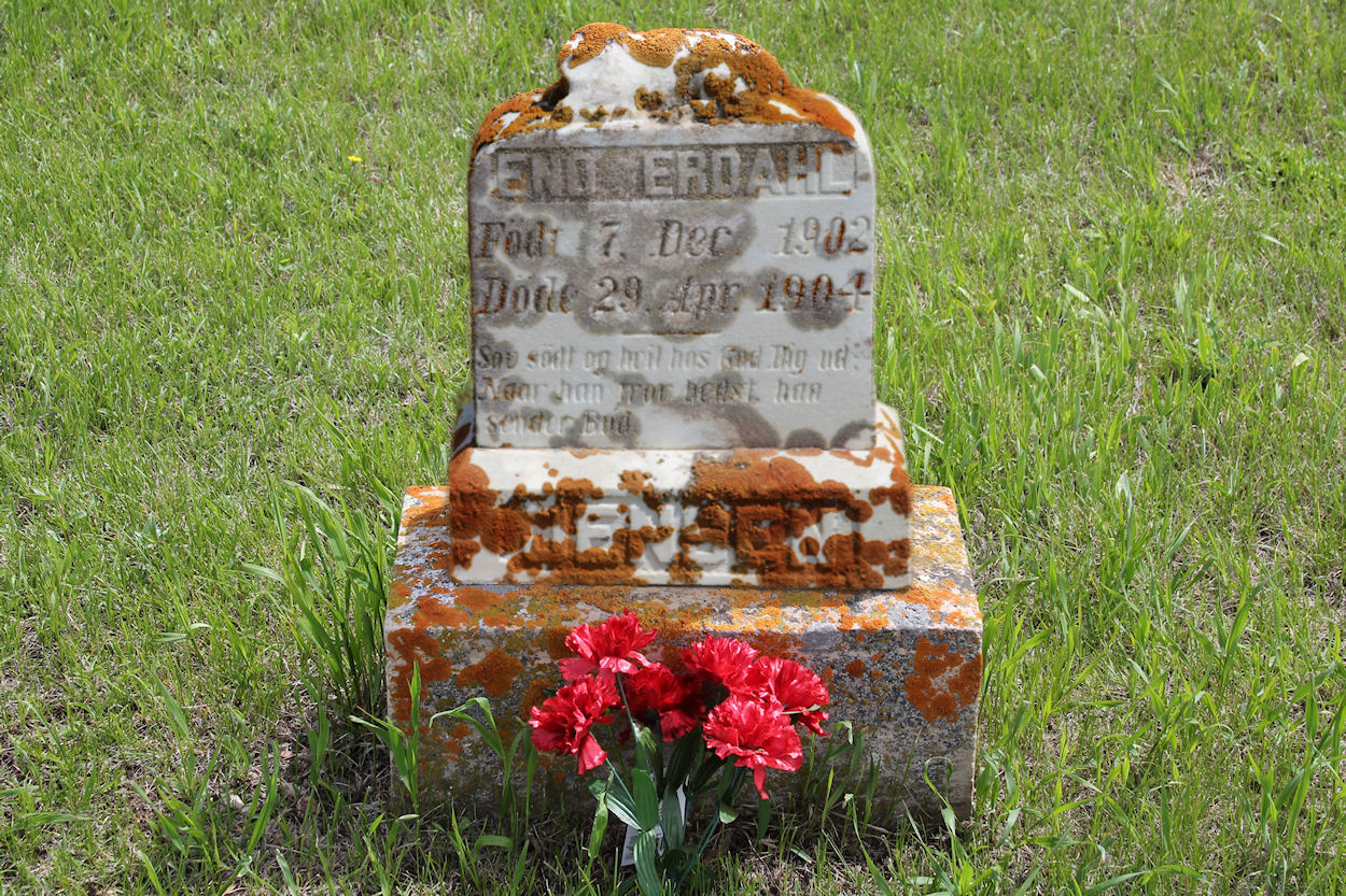 Headstone inscription: ENO ERDAHL Födt [born] 7. Dec. 1902 Döde [died] 29. Apr. 1904 Sov södt og hvil hos Gud Dig od; Naar han n'or bedst han sender Bud. [Sleep sweetly and rest with God today; To those he loves best he sends Angels.] JENSEN