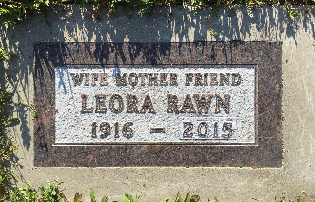 Headstone inscription:WIFE MOTHER FRIENDLEORA RAWN1916-2015