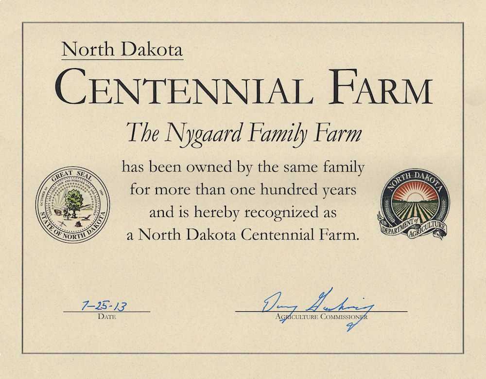 The certificate officially designating the Nygaard Family Farm as a North Dakota Centennial Farm.